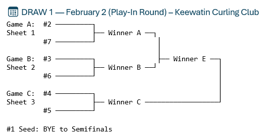 Teams listed first will practice first and throw the top of the scoreboard colour. Each team will have a 9-minute practice followed by a draw to the button following NOCA rules—one clockwise, one counter-clockwise. Each player must throw a pre-game draw to the button within the first three games of the season. After that, any player may throw in any game, but only once per game.