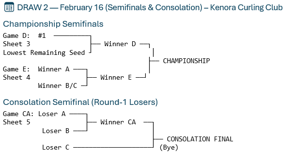 Games will be 8 ends using 30 minutes of thinking time per team, per NOCA rules. Each team receives one 60-second timeout. The team on a bye will handle timing and measuring duties.