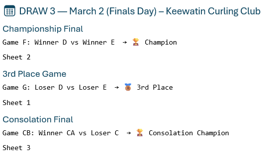 Games run on Mondays and Thursdays, from October 20, 2025 - April 2, 2026 at 9:30 AM. Games are typically 8 ends and finish around 11:30 AM.
